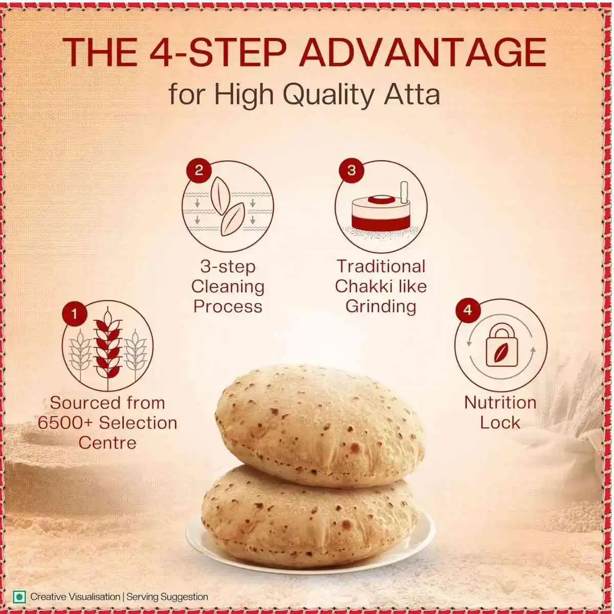 • FINEST QUALITY ATTA: The 4-step advantage process of sourcing, cleaning, grinding and nutrition lockage ensures high-quality atta
